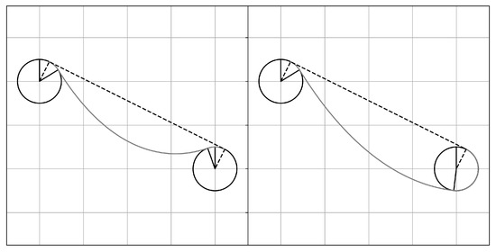 When the thin-sheet material is transported from one roll to another, its projection curve along the rolls’ axes between two contact points with rolls can be described with Equation (5). As shown in Figure 4, the upstream roll is located at coordinate , the downstream roll is located at coordinate . The radius of the upstream roll and the downstream roll is and respectively. The touchpoints between the sheet and the two rolls are B and C. The upper external co-tangents of and is . The angles between the vertical direction and and are and , respectively.