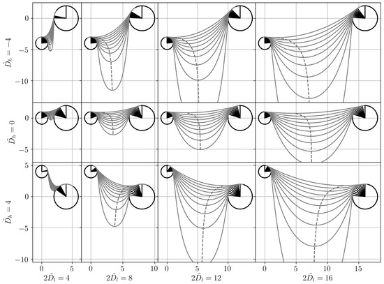 The convergence of this algorithm is verified using the exhaustive method when , . Figure 6 shows the shape of the moving thin-sheet materials (solid) between rolls when position of rolls varies and . Figure 6 also shows the track of the lowest point on the sheet (dash). This work uses HYBRID of MINPACK [38] in numerical computation.