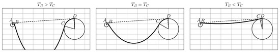 It should be pointed out that for some specific parameters (when ), the maximum tension point may change between B and C as the length changes. For example, when , as shown in Figure 7, point C has greater tension when the sheet is tensioned and point B posesses greater tension when the sheet is relaxed.
