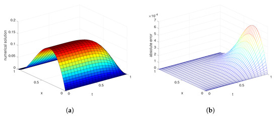 Figure 1 shows the numerical solutions and the distribution of absolute error when , and . Note that numerical solutions are highly aligned with exact solutions.