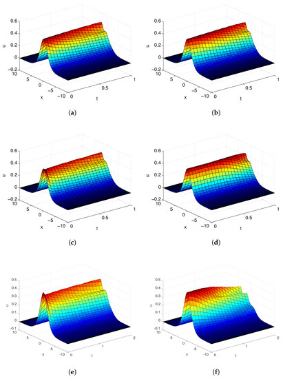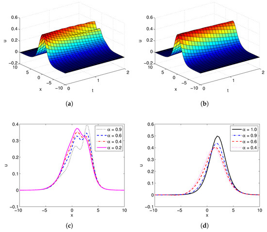 Applying the proposed finite difference/collocation scheme, we obtain the numerical solutions over the domain under different situations. Firstly, letting , the generalized fractional derivative in (10) is equivalent to the Caputo fractional derivative. Figure 2 shows the influence of and under conditions of , . By fixing , diffusion processes with and are illustrated. It is shown that when is small, the soliton (initial condition) will be decomposed to neighboring solitons, whose amplitudes are affected by the fractional derivative . This decomposing phenomenon cannot be observed when becomes larger. In the case of , the soliton wave does not move much with as expected, and with the decreasing of , the amplitudes are getting smaller.