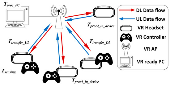 Wireless multi-user VR systems based on IEEE 802.11 standards can be described as in Figure 1, which shows the elements of wireless multi-user VR systems, VR data flows, and delay components of VR services. In order to provide an immersive VR interaction experience, each component of the VR system shall provide proper feedback, based on its sensing data. From delay components of Figure 1, the VR interaction delay of a wireless VR system, Tvr, can be described as follows.