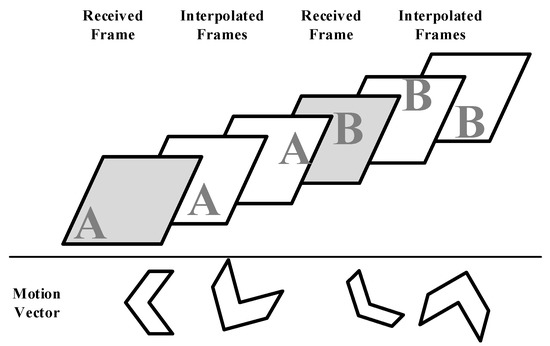 The VR application layer described in Figure 3 is a protocol layer that provides VR images and control information on VR devices. VR video frames are generated using the frame rate that is reported by VRCL, and a detailed explanation on VRCL is provided in Section 2.2. The generation rate of the VR video frame is restricted by the VRCL, and it prevents the VR application layer from generating meaningless video frames. For VR controllers and VR headsets, motion-tracking information measured by sensors in VR devices is accommodated and utilized in this VR application layer. VR devices, especially VR headsets, would generate interpolation frames in this layer. The interpolation frame is the frame that needs to be displayed between the received real video frames delivered by a VR AP. These interpolated frames could be generated by performing many effective interpolation algorithms [11,12,13,14,15,16]. In this paper, VR video interpolation frames need to be based on motion-tracking information that is measured by VR sensors in VR devices [20,21,22]. Because this situation was not previously defined, further optimized interpolation methods should be studied.
