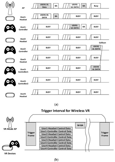 As a result, VR devices including VR APs need to have special multi-standard protocol architecture, described in Figure 3, to support VR connections based on WLANs. IEEE 802.11ax is the amendment standard for highly efficient WLAN in multiple-device scenarios. IEEE 802.11ax defines a trigger frame to accommodate multiple uplink frames from multiple devices simultaneously [19]. In many scenarios, it may be utilized in parallel with a conventional single-frame transmission. If the trigger frame requests stations to transmit its UL data, each station transmits its data without additional channel access delays. This trigger frame is able to substantially reduce the contention delay of WLAN systems.