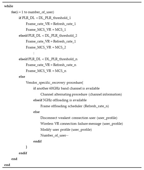 Not only does the VRCL provide information that can be used to control VR video frames to the VR application layer, but VRCL also controls its network operations based on information that is provided from the SME. The packet loss rate, received signal strength indication (RSSI), and modulation and coding scheme (MCS) index information are the representative information observed by VRCL. Based on the observed information, VRCL could control the MCS level, channel bandwidth, frame arrival rate, number of users supported by the VR AP, and so on. The 60-GHz and 5-GHz standards may be utilized by VRCL, because of its efficient multi-user VR operation. The main purpose of the 60-GHz wireless link, in this paper, is the delivery of a high-resolution VR video frame. Because that delivery requires a large bandwidth, the use of the 60-GHz standard is inevitable. A 5-GHz standard is employed to accommodate the multi-user UL frame, by utilizing the multi-user UL OFDMA procedure.