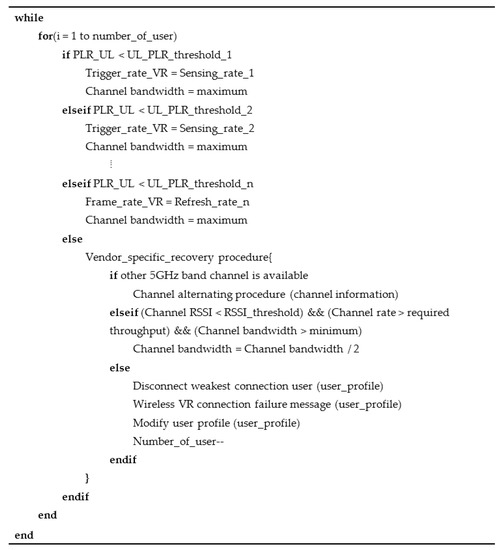 The VRCL in a VR AP could perform DL VR video frame rate control and UL VR sensing frame rate control, depending on its wireless connection status. Figure 5 shows how the VRCL controls its DL VR video frame rate. The manufacturer of a VR system could set its packet loss rate thresholds and corresponding VR video frame rate. A video refresh rate of 90 Hz is usually used in current-generation VR systems, but next-generation VR systems may support a refresh rate of at least 120 Hz. This means that “refresh_rate_1” in Figure 5 needs to be set to its native refresh rate of the VR display. Refresh rate parameters with larger index numbers should be set to a larger value than refresh rate parameters with smaller index numbers. For “DL_PLR_threshold” parameters, as listed in Figure 5, the same rules should be applied, and a parameter with a larger index needs to be set to a larger value. The proposed algorithm in Figure 5 aims to solve the connection problem of wireless multi-user VR systems, by controlling the required channel throughput. If the channel condition is worse than “DL_PLR_threshold_n” (see Figure 5), the VR AP should perform a recovery procedure. The recovery procedure can be modified by the manufacturer, but the use of alternating channels and 5-GHz off-loading is at least recommended. Figure 6 shows an algorithm that controls the trigger frame transmission rate. A high value for “Trigger_rate_VR” (see Figure 6) indicates a small trigger frame interval, based on the PLR history of the UL sensing data frame. Because associated VR devices never perform EDCA procedures, they are disabled by the VR AP, and only overlapped BSS (OBSS) stations could cause channel collisions and channel interference. Similar to DL VR video frame rate control, the VRCL controls the frame rate and performs recovery procedure in poor channel conditions. In this paper, channel alternation and bandwidth modifications are recommended for the recovery procedures.