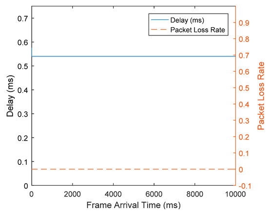 Even though the 10-ms delay performance was relatively good for multi-user VR, in the severe-interference case, the delay jitter still needed to be minimized. The proposed algorithm to control the trigger frame delivery rate in Figure 6 could handle this severe interference case. Because the proposed VR system could realize variable-motion sensing information delivery rates, owing to its VR video interpolation module in VR headsets, its sensing data report rate could be adjusted to a small value. In this study, we assume a 100 Hz to 1000 Hz sensing data report rate. If the channel conditions are very poor, the VR AP should set its trigger frame delivery rate to 100 Hz. In order to measure the effect of controlling the trigger frame, we simulated the case with a 100-Hz trigger frame delivery rate in the severe-interference scenario. The result is shown in Figure 10, and it showed that in the no-retransmission case, all of the frames were delivered in a 10-ms delay. This means that the proposed wireless multi-user VR system guarantees a 10-ms wireless uplink delay, even in the presence of severe channel interference.