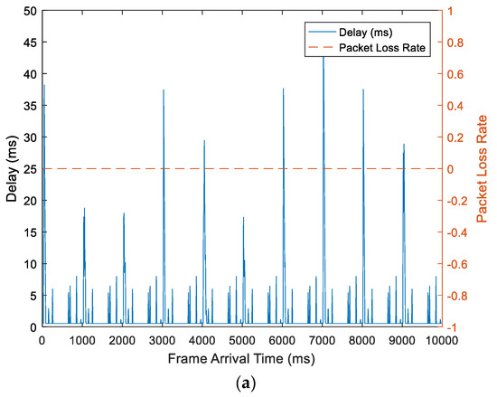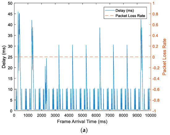 In conventional EDCA cases, nine devices generated their UL frames containing motion-sensing information every 1 ms. For conventional EDCA cases, the packet loss rate and Ttransfer_UL are shown in Figure 7. Because VR systems require real-time processing, the number of maximum retransmissions did not need to be set to a large number. If it was set to 2, as shown in Figure 7a, it would lower the PLR for a short time, but then increase to 0.4 PLR shortly afterwards. From the start, the PLR observed in conventional EDCA cases was not usable for consumer VR devices. In the no-retransmission case, as shown in Figure 7b, even though there was a large PLR and relatively small delay, not only was the PLR destructive, but the delay also could not be used. After 8 s, the delay value increased over 1 s for the motion-sensing data delivery. From the results of Figure 7, we can observe that conventional EDCA procedures cannot afford wireless multi-user VR systems. At a minimum, wireless VR systems require ms-level delays and a very low PLR for reasonable user experience.
