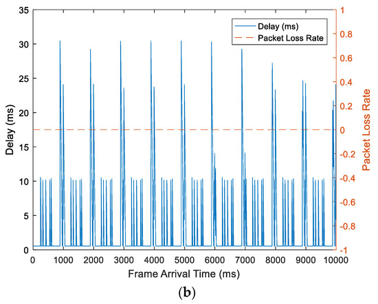 Although the proposed architecture and schemes work very well, as shown in Figure 8, the channel condition could be worse, owing to interference devices in the 5-GHz frequency band. As opposed to 60 GHz band radio, the 5-GHz band radio has a relatively long transmission range, interference range in this case, and 5-GHz frequency band devices are widely used by ordinary consumers. This means that a VR AP should consider the influence of interference. In order to consider and measure the effect of channel interference, in this paper we considered nine additional IEEE 802.11 devices that utilized the 5-GHz band. Each device generated its data frame with an air time of 10 ms every 1 s. The result is shown in Figure 9, and as opposed to the no-interference case, these results showed relatively large delays. Most frame-delivery delays were under 10 ms, but a large delay jitter was observed. If we set the maximum number of retransmission parameters to 0, the delay jitter would be decreased, as shown in Figure 9b.