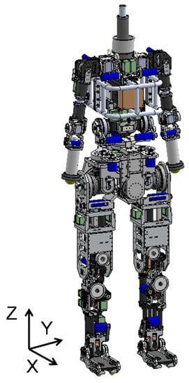 We combined the upper body developed as described above with the lower body to produce a whole-body humanoid (see Figure 5). The humanoid has 22 degrees-of-freedom (DOF) in total. The brushless DC motors which can output 200 W are implemented in the joints which needs large output such as the shoulder pitch, trunk, hip pitch, and knee joints. On the other hand, the smaller motors which can output 100 W are implemented in other joints. The specifications of the upper body for the link length and mass properties are listed in Table 5 and Table 6. The parameter values of the humanoid mimic those of a human in almost every respect. The mass of the humanoid is 60 kg, and the height is 1500 mm. In the case of a human, the COM position of the whole body is located near the pelvis, the height of which is approximately 56% of the standing body height []. The robot mimics the whole-body COM position by mimicking the link length, mass, and COM position of each link.