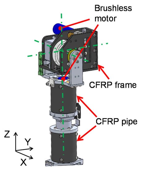 Therefore, we considered the material properties required for the structural members of the humanoid robot to best mimic the size and mass properties of a human. Aluminum is typically used for the structural members of a robot. The structure of the upper body of most humanoid robots are exoskeleton structures, wherein the frame shapes the body, and every component, such as motors and electrical parts, is stored in the frame. It is difficult to save the weight of the upper body because the amount of aluminum parts for shaping the body are increased. For weight saving in the links, we used carbon-fiber-reinforced plastic (CFRP), which is extremely strong yet also light. The density of CFRP (1.5 g/cm3) is much lower than that of aluminum (2.7 g/cm3). CFRP pipes were used in the center of each link, similar to the inner skeleton structure based on the human structure, with actuators, motor controllers and cables placed around the pipes (see Figure 2 and Figure 3). In the torso link, a large twisting moment is loaded for generating angular momentum in yaw direction. To stand the twisting moment, two pipes were implemented instead of one big pipe (Figure 3). Consequently, the size of each link was close to that of a human’s, and the mass of each link was approximately 11% less than if it were made of aluminum.