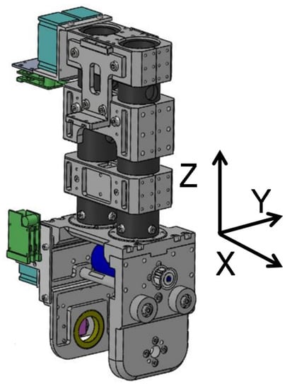 To fulfill the above requirements of an upper-body robot mechanism, we developed an upper-body mechanism that has human-like mass properties and can perform the motions observed during human running (see Figure 1). Some studies have been conducted using humanoid robots with upper-body mechanisms [,,,], but it is difficult to achieve human-like size, mass properties and motion. The reason for this is that human-like motion requires a high-power output, but high-power actuators are too heavy to mimic a human mass properties. For example, the mass of the upper arm of a human may be 1600 g. Three actuators are required in the upper arm for the shoulder and elbow joints. However, the mass of each actuator, including the gear, is approximately 400 g. We considered the use of brushless direct-current (DC) motors as actuators, because they are small and light and can output high power. Based on the upper body motion during human running shown in Table 4, the maximum joint power of the shoulder pitch and trunk joints is around 150 W, and that of other joints is even smaller. Implementation of such actuators requires that the mass of the other parts, such as the frames connecting each joint and the electric parts, be less than 400 g. We must save the weight of frames; however, the frames must bear the load derived from large angular momentum for preventing yaw rotation.