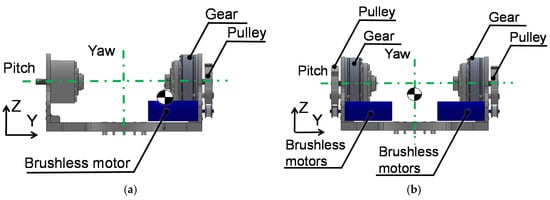 Achieving a human-like COM position and inertial moment requires axial symmetry of the structure of the torso. Some humanoids have a torso mechanism actuated by a motor and a gear implemented on only one side (see Figure 4a). In this type of mechanism, the COM position of the torso is inclined from the center in the frontal plane and is thus different from that of a human. It therefore produces an angular momentum that is different from that of a human. A humanoid robot developed using this type of mechanism cannot mimic human-like motion by generating the same angular momentum. A counterweight can be used to shift the COM position, but the total mass of the mechanism may still be too large compared with that of a human. To solve this problem, we implemented a symmetrical joint mechanism with two of the same actuators and gears (see Figure 4b). The COM position was thus shifted to the center of the torso, as in a human. With two actuators in parallel, each actuator and gear required less power when only one actuator was used, which made it possible to decrease the size and weight of the actuator. As a result, the mass of the mechanism was decreased by approximately 550 g compared to that associated with using a counterweight. The weight of each part of the upper-body mechanism could therefore be decreased. Thus, the weight could be freely distributed, and the COM position could be regulated more easily.