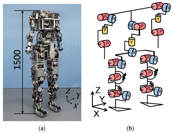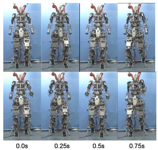 Humanoid robots are expected to be useful in various environments where people live. The reason for this is that humanoid robots, which are close to humans in behavior and functionality, are easy to adapt to the living environment designed for human beings. In addition, while other robots have only a few controllable joints, humanoid robots have more than 20 joints and can negotiate various scenarios. Locomotion is necessary to work in various situations, and so far, many studies have been performed on stable walking motion generation techniques. In recent years, running, which is a movement mode including the flight phase with a faster moving speed compared to walking, has also attracted attention, and research is being advanced on running motion generation methods to improve the movement ability of a humanoid robot. Raibert et al. developed a running robot with a single linear leg []. The bipedal robot ATRIAS has a four-bar leg mechanism that includes a series of elastic springs [,]. Hyon et al. developed a biologically inspired robot based on a dog-leg model []. However, these robots do not have a human-like structure. Some studies have shown that bipedal humanoid robots can run [,,,,]. For example, the Advanced Step in Innovative MObility (ASIMO) humanoid robot, which was designed and developed by Honda, can run at a speed of 2.5 m/s []. Toyota’s bipedal humanoid robot can run using a zero-moment-point (ZMP)-based running control system []. The athlete robot developed by Niiyama et al. has a human-like musculoskeletal system built to execute dynamic motions, such as running []. The bipedal robot MABEL, developed by researchers at the University of Michigan, has leg elasticity that originates from a leaf spring. It is the fastest-running of all currently available bipedal robots, having achieved a speed of 3 m/s with axial constraints on the y-axis [].