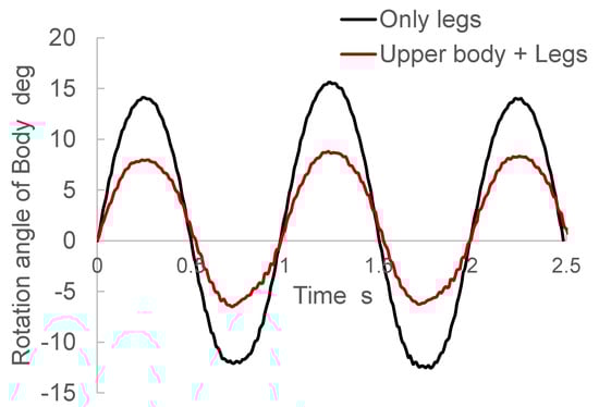 We conducted an experiment to evaluate how effectively the humanoid could compensate for the angular momentum generated by the leg motion during the flight phase. In this experiment, the humanoid was suspended in midair to perform running motion during the flight phase without any constraint in the yaw direction. The lower-body joints were controlled according to the joint angle references based on the human motion data []. We verified the humanoid turning angles in the yaw direction depends on whether control is provided, which depended on the angular momentum in the yaw direction. We measured the turning angle of the waist in the yaw direction using a motion capture system that included infrared cameras used to determine three-dimensional marker positions at 120 Hz. Spherical retro-reflective markers were attached to the surface of the waist parts of the humanoid near the COM of the whole body. The motion capture system calculated the segment attitude using the position data for some of the markers. When angular momentum compensation was not employed, each joint of the upper body maintained a neutral position. When angular momentum compensation was employed, the angular momentum generated by the leg motion was calculated, and the upper body moved to compensate for the angular momentum actively. The ratios of the arms contribution and trunk contribution were determined to be 0.8 and 0.2, respectively, based on the human running data [] in which the angular momentum generated by the arms was 1.2 kgm2/s and that generated by the trunk was 0.3 kgm2/s. The lower-body motion of each joint was determined to follow an approximate sine wave as Equation (10), based on the human running data [].