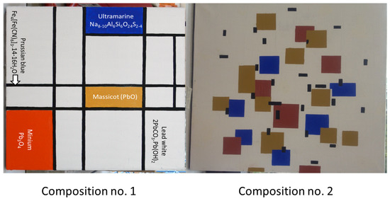 Mondrian replica— a replica of a Mondrian painting covered with a thick lead white layer and on top of it a different Mondrian replica. The goal of this sample is to find traces of the replica underneath the lead white layer and to distinguish the different pigments. The overview of both replicas is shown in Figure 2 and the full composition is schematically provided in Figure 3.