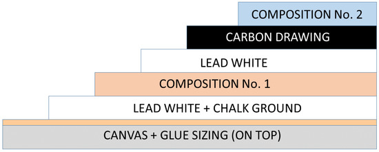 With those results, we can conclude that the inspection of composition no. 1 is possible with a similar or even better accuracy using active thermography and an IR-B+C’ camera with respect to the well-known IR-A reflectography technique. It should be marked that the selected test sample contains a very thick intermediate layer of lead white. Unfortunately, with state-of-the-art techniques, those paintings below a painting with a thick lead white layer are very difficult to inspect. With these results, we can conclude that the use of active thermography can provide a relatively fast way to evaluate the presence of sub-layer compositions.