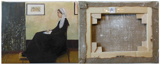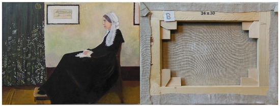 James Abbott McNeill Whistler reproductions Both canvas prototypes are composed of hybrid textile supports with different textile fibres. The original painting techniques are reproduced of the original artwork produced by James Abbott McNeill Whistler in 1871, entitled Portrait of the Painter’s Mother [20]. The main goal for these reproductions is focused on the identification of the canvas structure and to compare the painting strokes. The dimensions of the specimens are 24 cm × 30 cm. The textile support of canvas A was made from hemp and nettle fibres and is shown in Figure 4. This support structure is close to that of the original artwork. While the textile support of canvas B was made from flax and juniper fibres, which is shown in Figure 5. The force used on the paint brush was almost double with respect to the force used in painting A. The method to paint by pressing on the canvas through the paint brush is in contrast to the technique used by the art masters of that time [20].