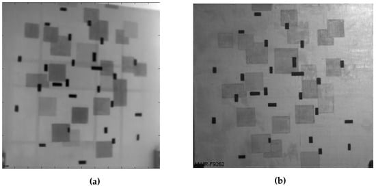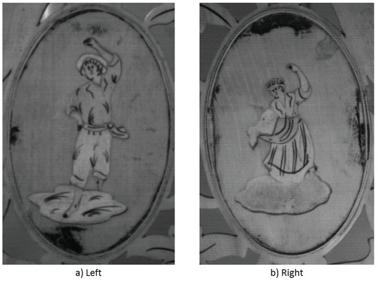 With respect to the wooden marquetries, in this case, the goal was to inspect both structures on structural integrity. This is performed using IR-A reflectography and active thermography using the IR-C’ camera. The reflectography measurements are performed using halogen illumination of 1000 W and the raw results are shown in Figure 17 for both structures. In the visual pictures of Figure 6, it is seen that both marquetries are restored previously; unfortunately, it is not possible to see why. Within the IR-A results, the original defects are prominent visually, which delivers more in-depth information about the reason for restoration. However, no new defect can be found and the applicability is limited.