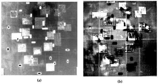 Reflectographic results on the Mondrian painting. (a) IR-A results of Mondrian compositions with halogen illumination. Composition 1 appears mixed with composition 2; (b) IR-B reflectographic results using the filter around and halogen illumination. Composition 1 remains hidden.