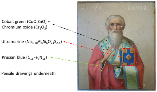Visual photograph of Saint Nicholas icon with known pigment characteristics indicated.