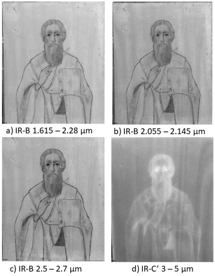 A non-simultaneous multi-spectral inspection using a set of detectors covering from the ultraviolet to the terahertz spectra was performed on a panel painting in [19,20]. It was observed that underdrawings contrast increases with wavelength up to 1700 nm and, then, gradually decreases. It should be clearly marked that, within this research, an essential gap occurred between the spectral range of the Short-wave infrared (SWIR)/IR-A camera (0.9–1.7 ) and the Mid-wave infrared (MWIR)/IR-C’ cameras (3–5 ). In addition, it is shown that IR thermography can be considered an alternative technique for the detection of underdrawings. The work of Walmsley et al. and van Asperen de Boer both suggest that the ideal wavelength band for observation of underdrawings should be located around (IR-B) [21,22], which will be investigated in depth within the current manuscript using a high-end combined camera, which is sensitive in IR-B and IR-C’.