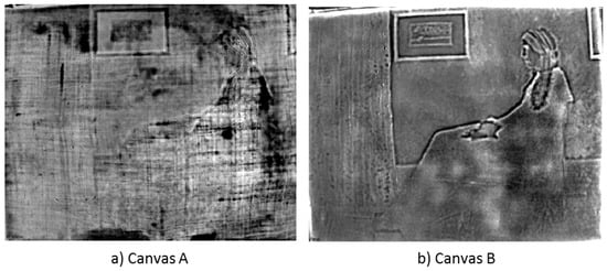 With respect to the results described in Section 3.1, it could be concluded that IR-A reflectography from the front side will not penetrate the canvas. Therefore, we opted to position the illumination source from the back. In this way, a registration is made of the transmitted energy only. It was found that the 940 nm IR LED illumination source of 800 W delivered the most promising results, which are presented in Figure 14. The hemp and nettle fibres of canvas A have a thicker and less structured appearance, which makes them clearly visible through the upper paint layers. This is in large contrast with the fine structure of the flax and juniper fibres of canvas B. It should be marked that the information is only visible for the center of the canvas and an access to the back side of the canvas is mandatory.