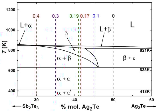 Part of the phase diagram of the Sb2Te3–Ag2Te pseudobinary system based on data of []. Dashed lines indicate the nominal compositions x of synthesized samples Ag1−xSb1+xTe2+x; α—solid solution of Ag in Sb2Te3, β—Ag1−xSb1+xTe2+x (0.08 < x < 0.41), ε—solid solution of Sb in Ag2Te.