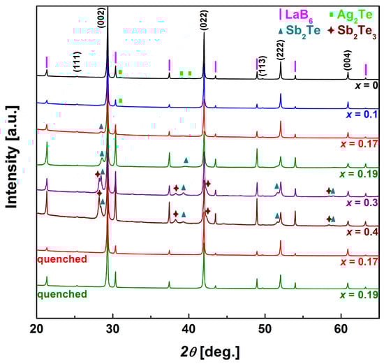 Phase composition of Ag1−xSb1+xTe2+x alloys was verified using PXRD experiments coupled with DTA thermal analysis. PXRD patterns of as-cast samples are presented in Figure 2. Main reflections were assigned to the β phase with NaCl-type crystal structure. The presence of small amounts of secondary phases is revealed. The slow cooling process does not allow obtaining single-phase materials in the whole analyzed compositional region, in agreement with the phase diagram [] (Figure 1). The existence of Ag2Te and Sb2Te3 precipitations after slow cooling, especially in samples from the compositional region of the β phase, is the result of the eutectoid decomposition of the latter in the reaction β ↔ α + ε at 633 K []. However, the rate of this process is so small that even slow cooling can impede it. PXRD analysis of samples after quenching reveals that this procedure effectively minimizes the quantity of secondary phases and in the case of alloys with x = 0.19 and 0.17 (compositions from homogeneity region of the β phase) enables us to prepare single-phase materials (Figure 2).