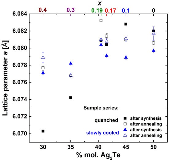 Assuming no interstitials and anti-site defects (Ag/Sb at 4a sites and Te at 4b sites only), increase of x (0 < x < 1) in the formula Ag1−xSb1+xTe2+x enhances the concentration of vacancies at 4a site and reduces the lattice parameter of the β phase. For the non-annealed samples, the lattice parameter increases with Ag-content for the lower silver concentrations and remains almost constant for more than 45 mol.% of Ag2Te. After annealing, the lattice parameter practically does not change with concentration (Figure 3). This behavior suggests a wider homogeneity range of the β phase at elevated temperatures. Particular temperature treatment (cooling rate, annealing) of Ag-Sb-Te samples results in the formation and certain ordering of vacancies at 4a crystallographic sites. Kinetic hindering of the formation and decomposition reaction of the β phase at 633 K inhibits the complete equilibration of the samples, even after long term annealing. Small discrepancies in values, between respective samples after annealing (from different series), are visible and show the importance of the thermal history of Ag-Sb-Te alloys. The above discussion is focused on the Sb2Te3-Ag2Te cross-section. However, the real homogeneity region of the β phase in the ternary Ag-Sb-Te system can be more complex and situated out of the Sb2Te3-Ag2Te cross-section, what was partially shown in [].