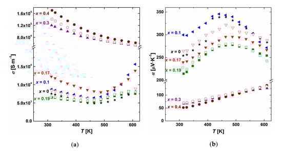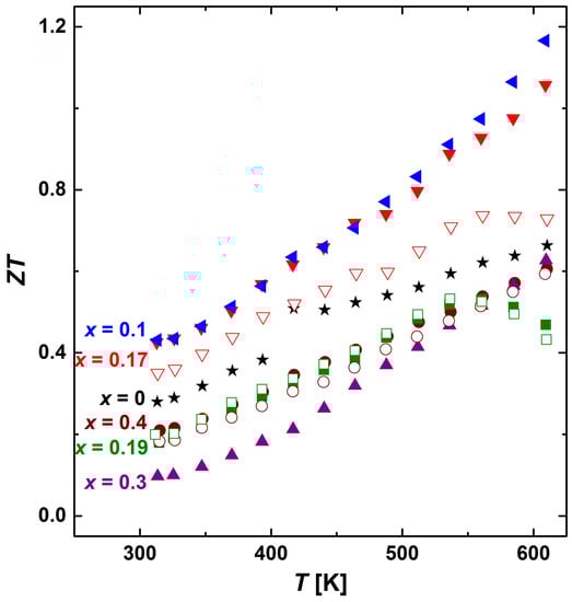 The temperature dependence of the Seebeck coefficient reflects that of electrical conductivity, and all alloys show p-type conductivity (Figure 5b). The lowest values were observed in alloys with x = 0.4 and 0.3 due to the precipitation Sb-Te phases. The other samples show higher Seebeck coefficients in the range of 200–375 μV∙K−1.
