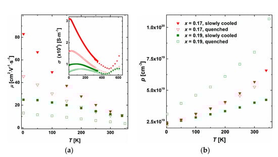 The electrical properties were measured in several heating-cooling cycles from RT to 610 K. During subsequent measurement cycles, the decomposition process occurs and both phase composition and microstructure differ from the starting ones. This effect is discussed later. Here, we present results of the first heating cycle only. Each sample show metallic σ(T) dependence up to 500 K (Figure 5a). The highest values of electrical conductivity were observed for Sb-rich alloys with a notable concentration of Sb-Te impurities (x = 0.3, 0.4), independent of the cooling rate. The conductivity is higher than 105 S·m−1 at RT and resembles values typical for the Sb2Te3 phase (1.5 − 2 × 105 S·m−1 in the range of 300–610 K, []). This phase seems to contribute most to the conduction of electrical current in those samples. Samples with lower Sb content (x = 0 – 0.19) display similar σ(T) values, between 0.5 × 104 − 1.3 × 104 S·m−1 after slow cooling and 0.4 × 104 − 0.9 × 104 S·m−1 after quenching. The observed decrease of electrical conductivity after quenching (for x = 0–0.4) can be a consequence of pronounced carrier scattering, related to notable changes in the microstructure (Figure 4) and impurity concentration. It is also consistent with the decrease of charge carrier mobility (Figure 6a). It seems that mostly mobility influences σ values at T < 350 K. For x = 0.17, carrier concentrations of slowly cooled and quenched samples coincide with each other. It is worth highlighting the increase of carrier concentration with x (Figure 6b). Following the assumption that vacancies at 4a site are present in Ag-Sb-Te alloys and have an influence on hole concentration [,,], the observed change in carrier concentration is expected. Low and high temperature data of σ perfectly coincide with each other, which proves the good homogeneity of the samples (inset in Figure 6a). At T < 200 K, σ is significantly increasing for x = 0.17, simultaneously with μ, and reaching the peak below 100 K (Figure 6a).