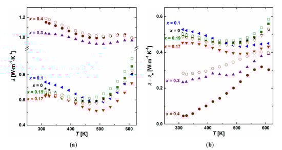 Thermal conductivity as a function of temperature is presented in Figure 7a. The electronic contribution to thermal conductivity λe was calculated from the Wiedemann-Franz law λe = L·σ·T (where L = 2.44 × 10−8 W·Ω·K−2 is the Lorenz number). The lattice part, containing also ambipolar contribution, was then determined by subtracting the electronic part from the total thermal conductivity. The highest values of thermal conductivity, 0.9–1.3 W·m−1·K−1, were observed for materials with a notable concentration of Sb-Te impurities (x = 0.4 and 0.3), mainly due to their significant electronic contribution to heat conduction. However, the λe calculated from the Wiedemann-Franz law seems to be overestimated for these samples, resulting in very low lattice contribution (Figure 7b). The other alloys exhibit twice lower λ(T) values, in the range of 0.4–0.7 W·m−1·K−1, similar to literature reports [,]. Lattice part is the main contribution to total thermal conductivity, independent of synthesis procedure (Figure 7b). Due to the included ambipolar part, values are slightly overestimated. Differences in thermal conductivity between samples after slow cooling and quenching, 5–10%, are on the level of measurement precision.