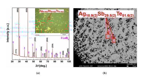 Structural characterization was carried out by powder X-ray diffraction (PXRD, Huber G670 Guinier camera, Cu Kα1 radiation, λ = 1.54056 Å, Δ2θ = 0.005°, HUBER Diffraktionstechnik GmbH & Co., KG, Rimsting, Germany). Data were collected at room temperature using LaB6 (NIST, 660a) as an internal standard. An experimental position of each reflection was corrected by comparison with standard, and lattice parameters of the β phase were calculated from least-squares refinement using WinCSD software []. Absence of C, N, O impurities was verified by elemental analysis (TCH600, C200, Leco, St. Joseph, MI, USA) and inductively coupled plasma optical emission spectroscopy (ICP-OES 5100, Agilent Technologies, Santa Clara, CA, USA). Thermogravimetry and differential thermal analysis experiments (TG-DTA: STA 449F3, Al2O3 crucibles; DTA: STA 409C/CD, SiO2 ampoules, Netzsch GmbH & Co., Selb, Germany ; heating rate: 5/10 K·min−1) were performed to identify phase transitions and to detect Ag2Te impurities.