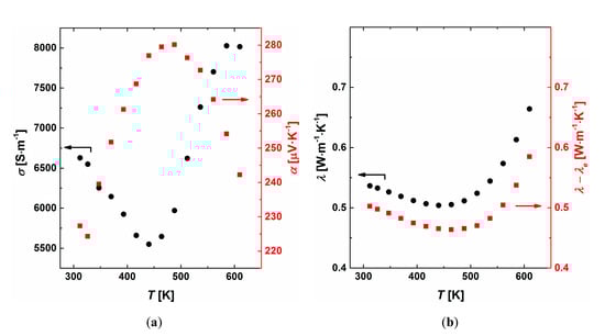 Electrical conductivity, Seebeck coefficient and total thermal conductivity in the temperature range of 300–610 K equal 5.5 × 103 − 8 × 103 S·m, 220–280 μV∙K−1 and 0.55–0.65 W·m−1·K−1, respectively (Figure 10a,b). The dependences σ(T). α(T) and λ(T) show extrema, suggesting ambipolar conduction to be an intrinsic property of the β phase. Charge carrier concentration is increasing from 3 × 1019 to 1 × 1020 at low temperatures (3–350 K, Figure 6b). Lattice contribution (together with ambipolar part) to thermal conductivity is higher than 90% of total λ, showing that phonon propagation processes limit the conduction of heat in the β phase (Figure 10b). The highest ZTmax value equals 0.4 at 550 K (Figure 8).