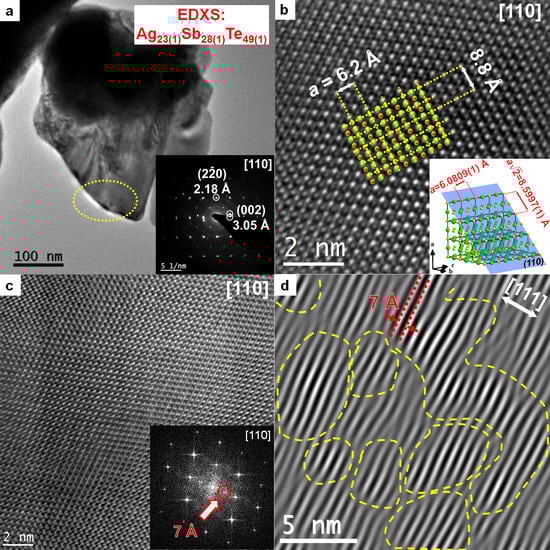 TEM analysis for particle I of quenched Ag19Sb29Te52 sample (x = 0.19): (a) Particle I together with chemical composition according to EDXS analysis. Inset: an SAED pattern from the whole particle I. Doubling of each reflection is the result of rotated second crystal below; (b) HRTEM image of a selected area within particle I (yellow dotted circle in Figure 11a) compared with unit cell cross section along [110] plane and lattice parameter refined from PXRD (inset); (c) FFT filtered HR image of another region of particle I. The FFT pattern contains additional reflections, with an interplanar distance of 7 Å, which indicate doubling of the unit cell along [111] direction (inset); (d) Bragg-filtered IFFT image composed only from additional reflections along [111] direction. Stripe pattern corresponds to crystallographic planes normal to [111] direction with period equals 7 Å.