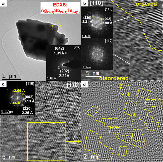 Particle II shows a gradual increase in the level of atomic disorder. Sharp reflections of NaCl type structure are becoming diffuse, while increasing magnification from the entire particle II to smaller regions (Figure 12a–c). Two scenarios were observed: (i) intermediate state with co-existence of large well-ordered and disordered regions (Figure 12b). FFT patterns ([110] zone axis), from both regions, comprise diffuse NaCl type reflections (insets in Figure 12b). (ii) Mosaic pattern with alternating ordered and disordered nanodomains (~2–5 nm) (Figure 12c,d). Additional reflections are distinguishable for the disordered region (yellow circles in FFT in Figure 12c), caused by similar orientation of nanograins with disturbed crystal lattices. Interplanar distances are larger than the theoretical values for the cubic structure, particularly in the disordered domains (inset FFT in Figure 12c). An average chemical composition of particle II is Ag22(1)Sb24(1)Te54(1), according to EDXS. Excess of Ag and deficiency of Sb was observed, in respect to the nominal composition Ag19Sb29Te52.