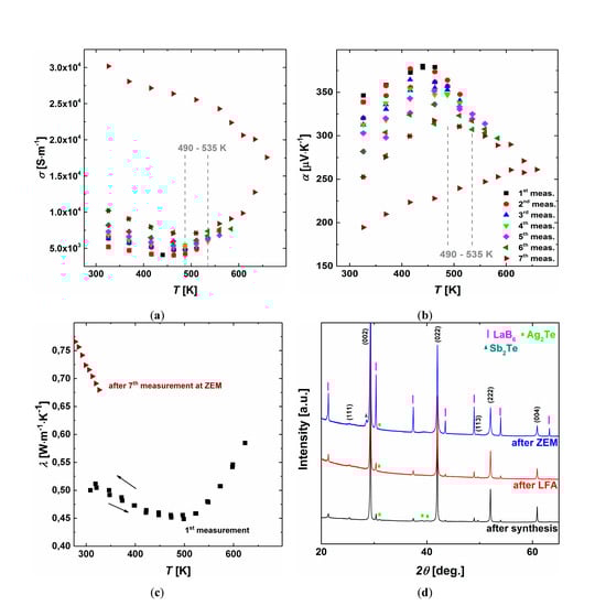 The eutectoid decomposition of the β phase below 633 K significantly affects TE properties of Ag1−xSb1+xTe2+x alloys []. One representative quenched alloy, x = 0.1, was chosen to show the degradation during the physical measurements below the formation/decomposition temperature of the β phase (Figure 13). Electrical conductivity values are reproducible up to 490 K (black squares in figure caption) and then monotonously increasing during the following measurements (heating-cooling part), from 5 × 103 to 30 × 103 S·m−1 at 310 K (Figure 13a). The gradual decrease of the Seebeck coefficient is visible, from 346 to 195 μV∙K−1 at 310 K (Figure 13b). It is a result of the formation of Sb-Te impurities (Figure 13d), which strongly influence the TE properties of Ag-Sb-Te alloys (compare Figure 5, Figure 6, Figure 7 and Figure 8). A slight increase in thermal conductivity was observed below 530 K even after one measurement cycle (Figure 13c). After the 7th measurement at the ZEM apparatus, λ increases by 35%, reaching 0.67 W·m−1·K−1 at RT. The discrepancies between subsequent measurements become notable in the range of 490–535 K. It leads to the conclusion that the decomposition rate of the β phase increases significantly at about 100–140 K below the decomposition temperature. Interestingly, ZT parameter at RT after seven measurements remains unchanged, due to significant increase of σ. All studied Ag1−xSb1+xTe2+x alloys (x = 0; 0.1; 0.17, 0.19, 0.3, 0.4) reveal presented behavior. Considering TE properties only, the experiment leads to the conclusion that Ag-Sb-Te-based materials could be utilized in TE devices working up to 490 K.