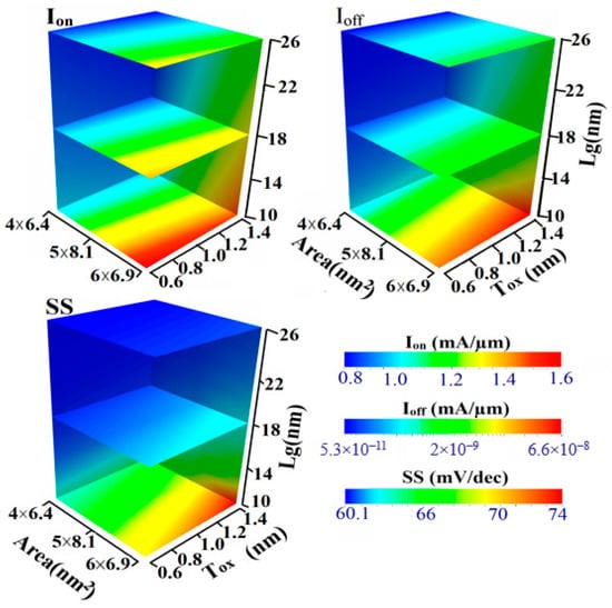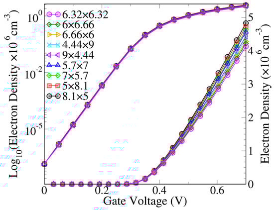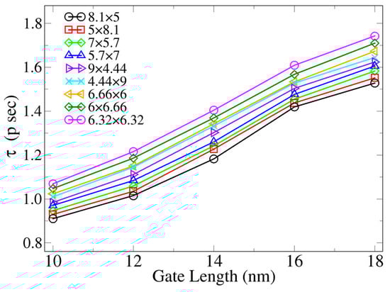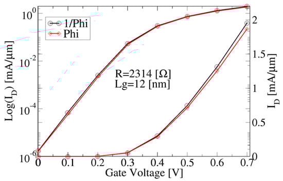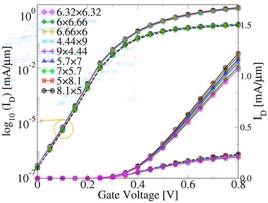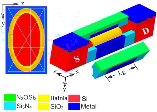 - Al-Ameri, T.; Wang, Y.; Georgiev, V.P.; Adamu-Lema, F.; Wang, X.; Asenov, A. Correlation between gate length, geometry and electrostatic driven performance in ultra-scaled silicon nanowire transistors. In Proceedings of the 2015 IEEE Nanotechnology Materials and Devices Conference (NMDC), Anchorage, AK, USA, 13–16 September 2015; pp. 1–5. [Google Scholar]