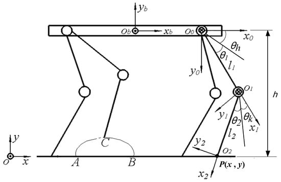 Where and are the balance position angles of hip and knee joints, respectively; and are the rotation angles of the hip and knee joints with respect to their balance position, respectively; and are the lengths of the femur and shin, respectively. By the D-H notation, the angles and corresponding to point can be solved via the inverse kinematics, which is given by