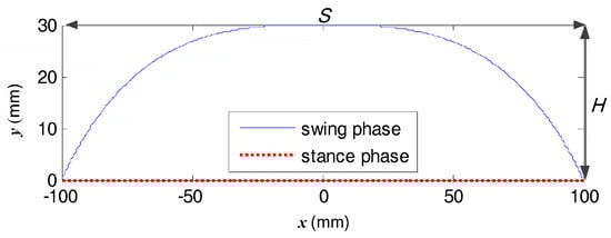 where is the stride length, is the maximum height of leg raise, and is the swing phase period. By analyzing the first and second derivatives of the equations, we can know that the velocities and accelerations on and of the foot are 0 at the time t = 0 and t = , which reduces the mechanical shock, energy loss and makes the robot’s movement more smooth.