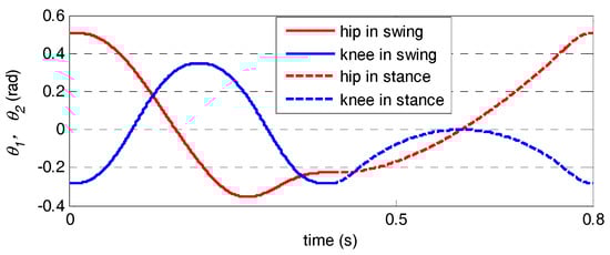 We set the scaling factor k = 0.1, the hip and knee joints’ balance position , and the parameters used in Equation (1) are chosen as mm. In the hip joint coordinate system , with the foot WT planned above, the coordinated angular displacement curves of the hip joint () and knee joint () in single gait period are shown in Figure 3. Besides, from Figure 3 we see that curves in joint space (motor commands) are smooth and fluent too.