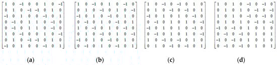 After introducing the gait matrix into Equation (11), we can obtain the corresponding connection weight matrix R. Further, the connection weight matrices of the four typical gaits are given by Figure 5.