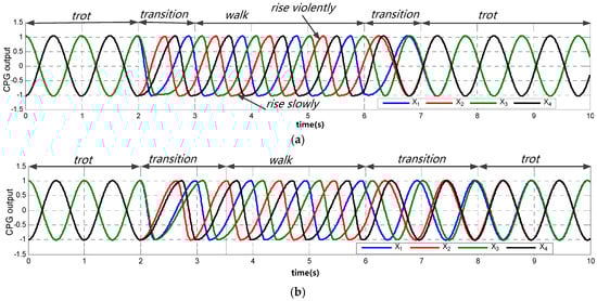 The output waveform of CPG in trot and walk gaits and their mutual conversions. (a) δ = 1, the output waveforms of CPG in tort and walk gait and their mutual transitions; (b) δ = 0.3, the output waveforms of CPG in tort and walk gait and their mutual transitions. The robot’s leg lift sequence is 1-3-2-4 in walk gait.
