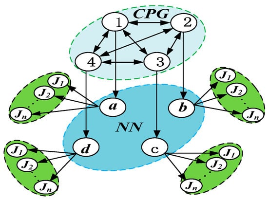 In Figure 8, the uppermost elliptical dashed box is the CPG layer and the middle elliptical dashed box is the trained NN layer, where a, b, c and d are the four identical NNs, which convert the CPG output into the multi-joint coordinated control signals within a leg (as shown in Figure 8, for example, the NN converts the CPG unit 1 control signal into the coordinated control signals of joint J1, J2, ... Jn of the left front leg), since the NN has the capability of multi-input and multi-output. What is important is that the more joints in a leg that need to be coordinated controlled, the more obvious the advantages of this control model. In Figure 8, we set the subscript n = 2, since the quadruped robot model used in this paper has only hip joint and knee joint within a leg.