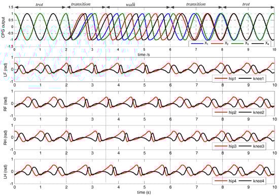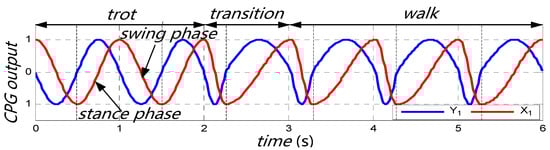 As the walk and trot gaits are the most representative, with the coupling intensity coefficient and respectively, the output waveform of CPG in the walk and trot gaits and their mutual transitions are shown in Figure 6, where , , s, the third term on the right side of Equation (9) is 0 since there is no feedback to the CPG, and in the walk gait while in the trot gait.