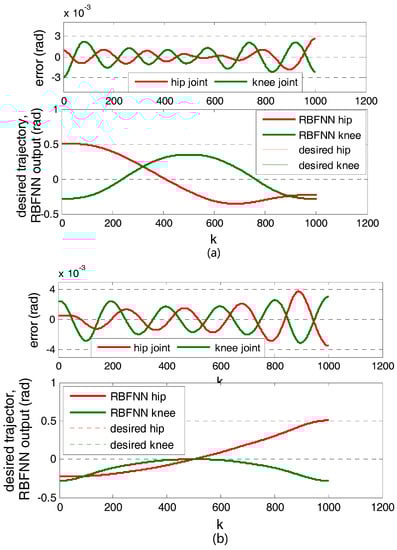 It can be seen from Figure 12 that the hip joint and knee joint angular displacement curves of the RBFNN are quite coincident with the curves of the preplanned WT, and their maximum absolute error is under in swing phase and under in stance phase respectively.