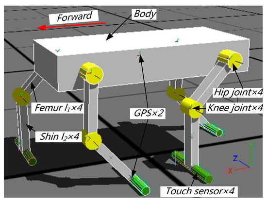 Webots is a development environment used to model, program and simulate mobile robots. First of all, a quadruple robot virtual prototype is created in the Webots simulation platform, as shown in Figure 14, where its components and configurations are the same as described in Figure 1. In addition, in order to facilitate the observation of locomotion performance and foot trajectory of the robot, the CPS sensors (used to obtain the location of GPS points in the world coordinate system of the simulation platform) are added in its body geometric center and foot point respectively. Meanwhile, the touch sensors were added at its foot, which were used to measure the force of the foot in the vertical direction.
