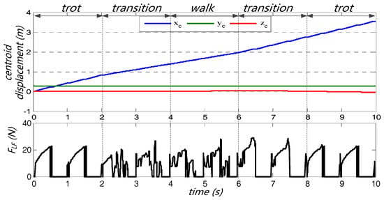 The simulation results with the representative trot and walk gaits and their mutual transitions are shown in Figure 15, Figure 16, Figure 17 and Figure 18, where the parameters of the CPG-NN-WT control model are the same as in Figure 13.