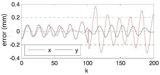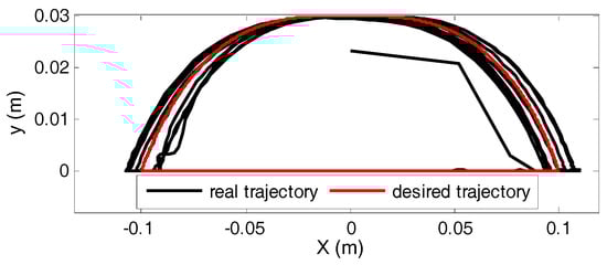 Figure 16 shows the comparison of the preplanned WT (desired trajectory) with real trajectory of the left front leg when robot is traveling. As shown in Figure 16, there are left or right shifts between the real trajectory curves and the preplanned WT curve due to the yaw angle, which is generated during the gait transition but which is not taken into account while processing data. However, the real trajectories are still in accordance with the preplanned WT if the effect of yaw angle is not taken into account, e.g., the real trajectory of which the yaw angle is 0 during the first gait period is in accordance with the preplanned WT well, and its maximum absolute error in x is under 0.4 mm, which is about S and its maximum absolute error in y is under 0.2 mm, which is about H, as shown in Figure 17 and Figure 18.